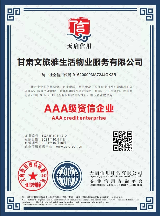 2021年,甘肃文旅雅生活物业服务有限公司认真贯彻落实习近平新时代中国特色社会主义思想,坚决落实集团公司各项决策部署。按照集团公司高质量发展要求,结合自身发展需要,公司于9月份正式启动3A体系认证工作,经过权威认证机构对公司信用管理、制度建设、管理体系等方面综合评估,10月底公司顺利通过3A体系认证,使得公司在管理水平、制度建设方面有了进一步完善及提升,增强了公司核心竞争力和品牌影响力,为公司高质量发展奠定了坚实的基础。