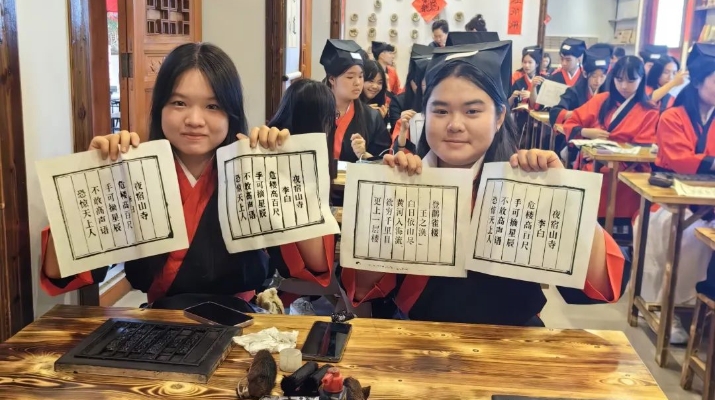 在河口古镇的国学活字印刷研学馆,港澳青少年们亲自动手体验了古代的活字印刷术。他们小心翼翼地摆放着字模,用墨汁轻轻刷过,再将宣纸覆盖其上,轻轻一压,一幅幅唐诗便跃然纸上。他们齐声用粤语朗诵了“悯农”“春晓”“相思”等经典唐诗,不仅领略了民间艺术的独特魅力,更在实践中感受到了中华文化的博大精深。