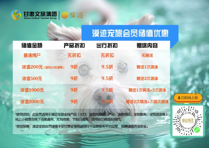 “漠迹宠旅”作为甘肃文旅科技公司精心打造的品牌,以宠物友好文化为核心,致力于为宠物家庭提供全方位、高品质的出行及消费体验。目前,宠旅线路游产品、宠物用品已全面上线,消费者可通过微信搜索“漠迹甄选”进入小程序选购,以预付充值形式成为宠旅会员,还可额外享受线路游和宠物服务的专属折扣。同时,通过“漠迹”抖音直播间购买预约兰州石佛沟、定西渭源携宠游服务,还可享受到景区免费门票、免费宠物游泳等叠加福利。
