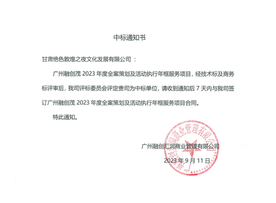 9月11日,在历经三轮的竞价谈判,经过层层筛选和激烈角逐,甘肃文旅集团旗下甘肃文旅运营集团子公司甘肃绝色敦煌之夜文化发展有限公司成功中标广州融创茂2023年度全案策划及活动执行年框服务项目。